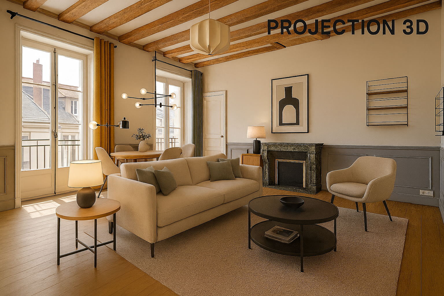 Agréable séjour baigné de lumière sur parquet avec cheminée ancienne
