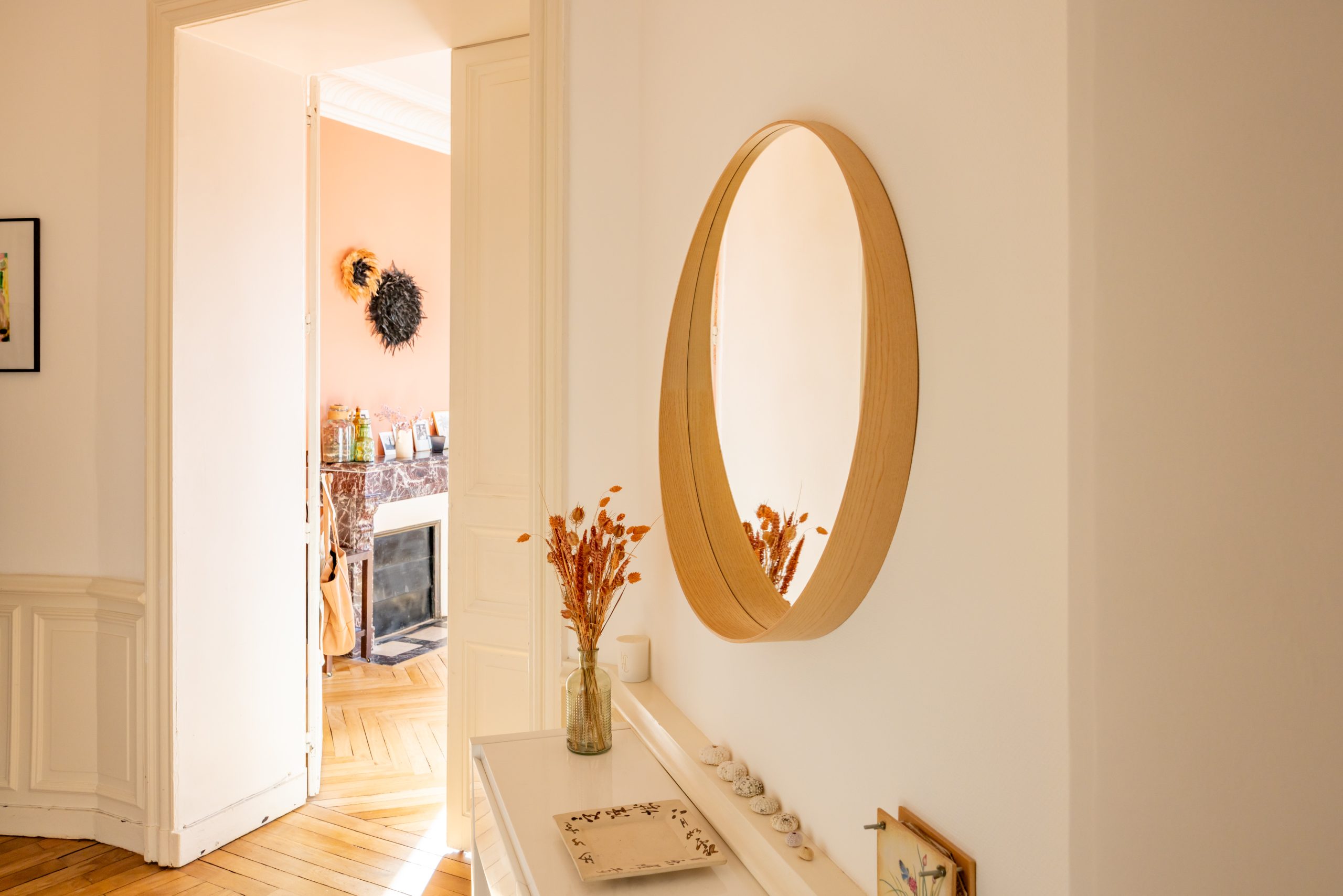 Agréable salon-séjour baigné de lumière sur beau parquet avec cheminée ancienne