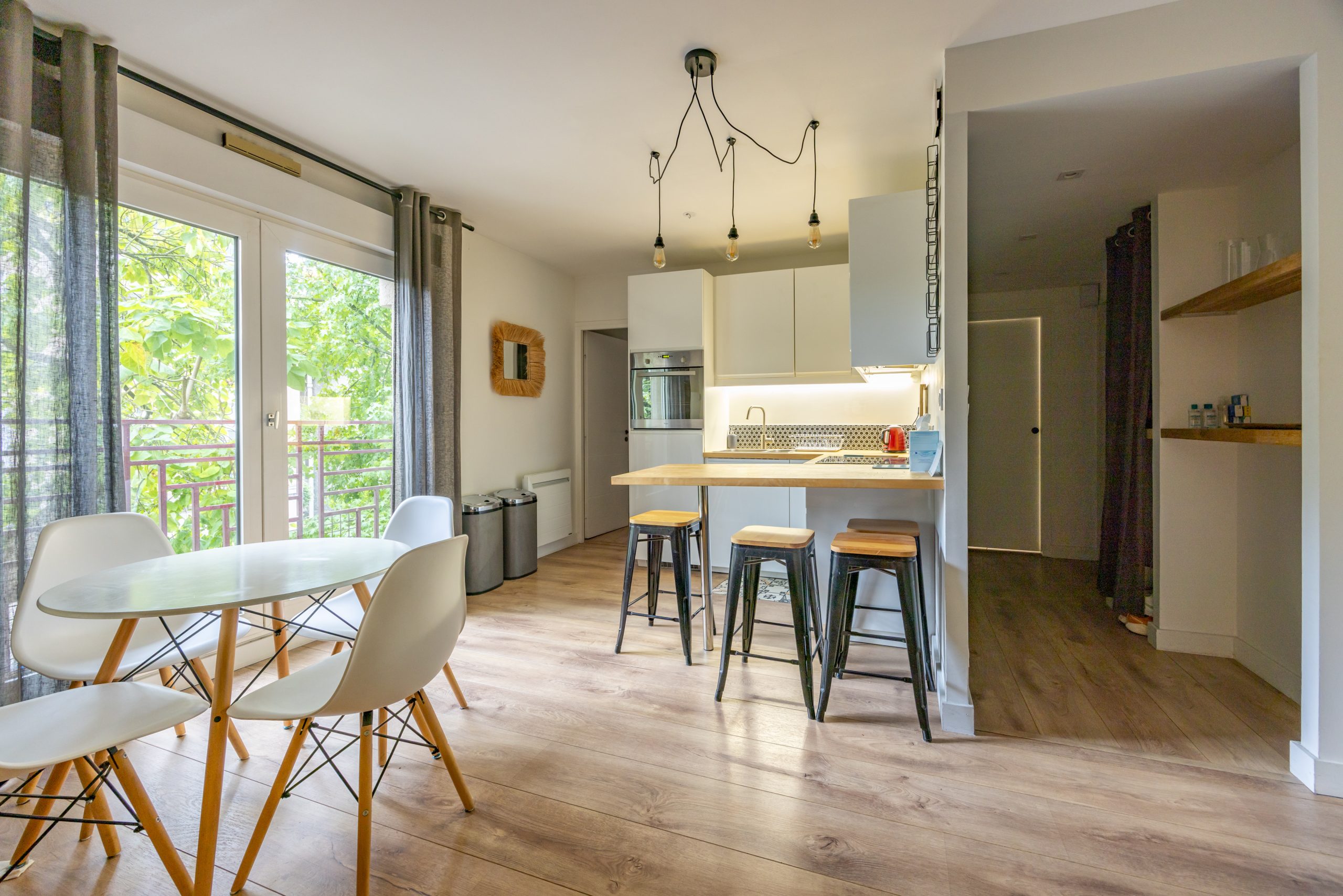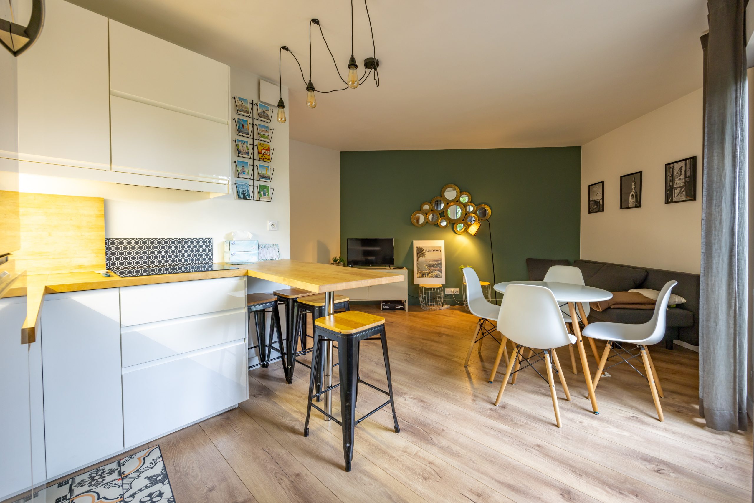Pièce de vie avec cuisine aménagée et équipée