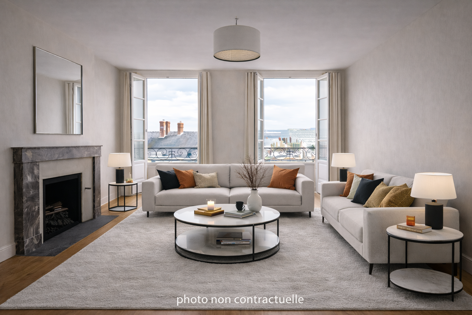 Hauteurs sous plafond, cheminée décorative, tomettes et parquet au sol