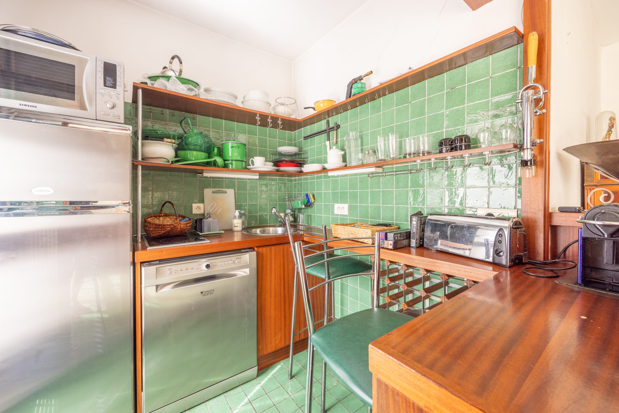 Coin cuisine aménagée et équipée ouvert sur le salon avec accès sur le balcon,