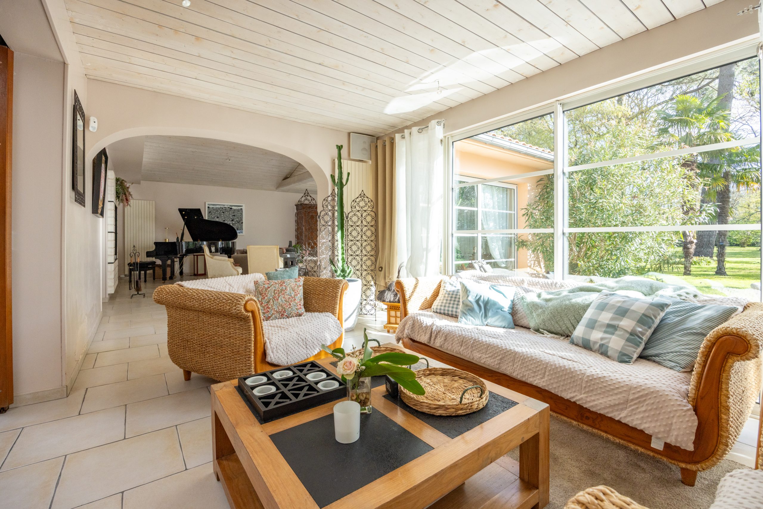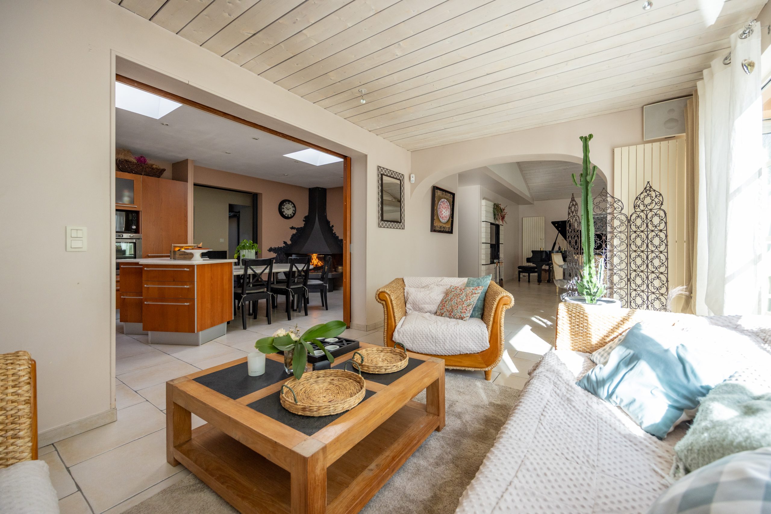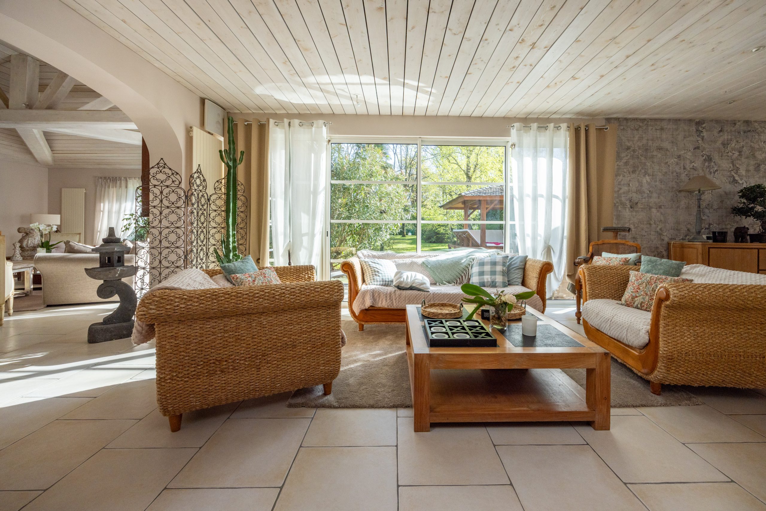 Le bien : Plain-pied de plus de 285 m² sur un parc paysagé et arboré de 2 800 m², entièrement clos, sans vis-à-vis. Grand carport et parking multi-véhicules avec atelier attenant.