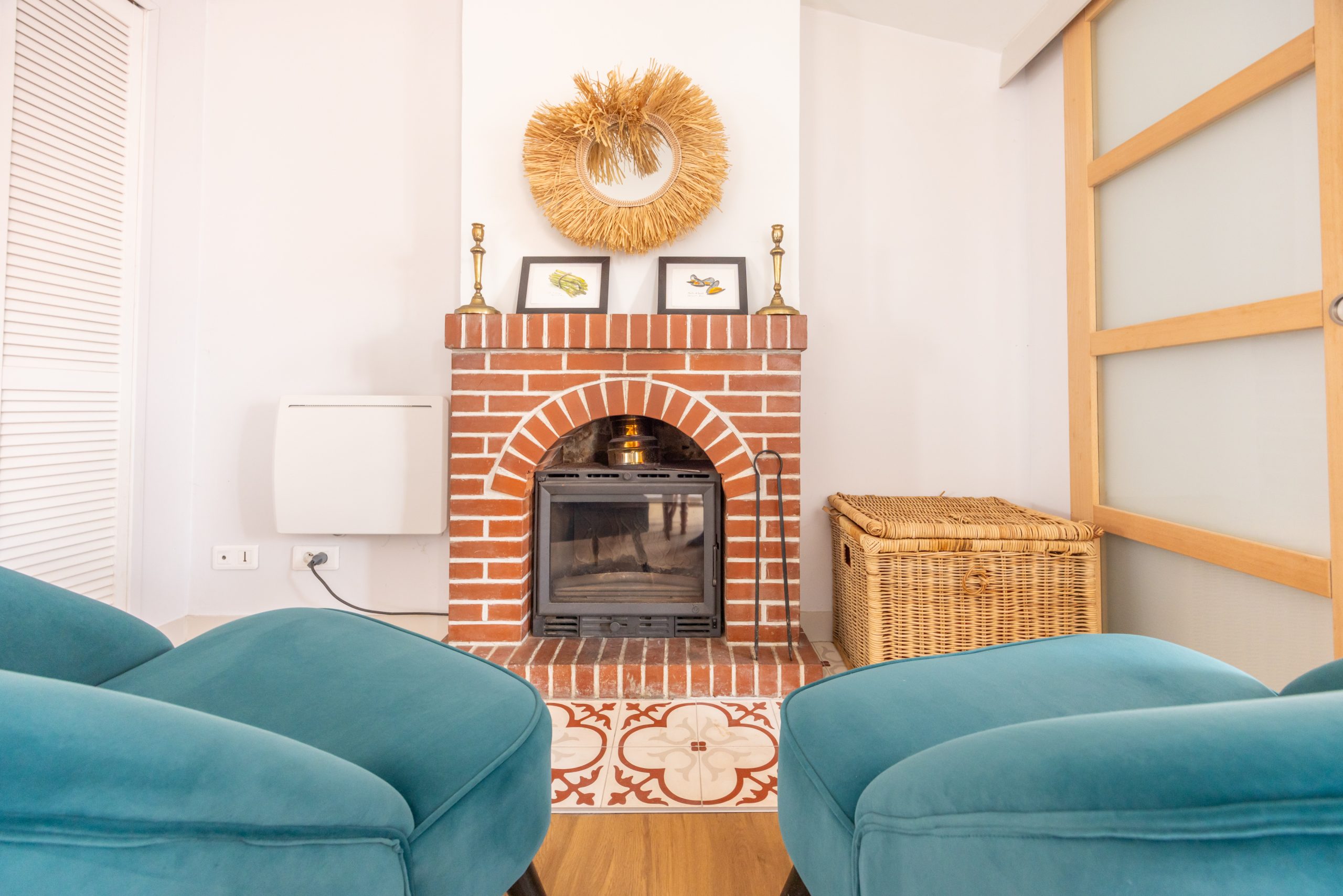 Une bibliothèque  chaleureuse avec une cheminée insert, idéale pour les soirées hors saison.