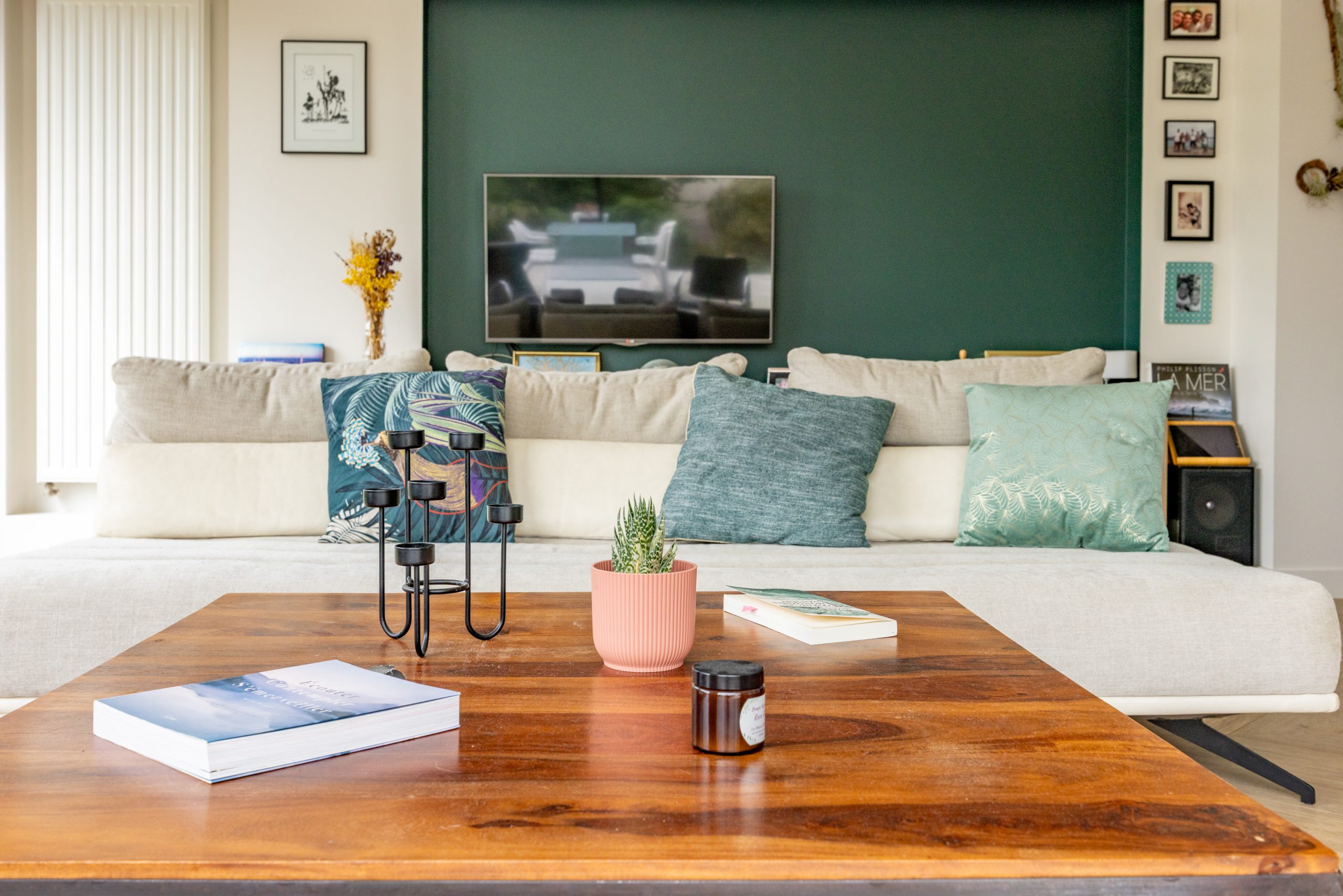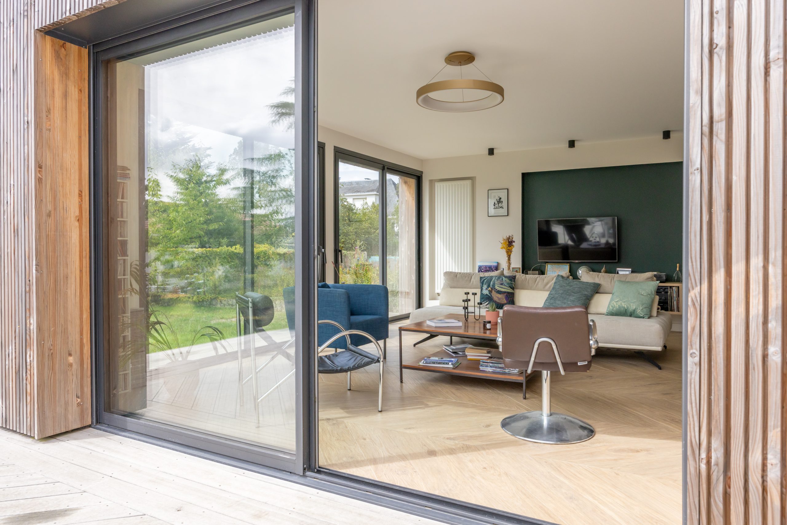 Grande pièce de vie chaleureuse, ouverte sur le jardin.
