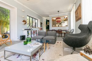 Salon-séjour traversant Est-Ouest sur parquet, avec cuisine ouverte fonctionnelle, parfaitement aménagée et équipée, wc séparé