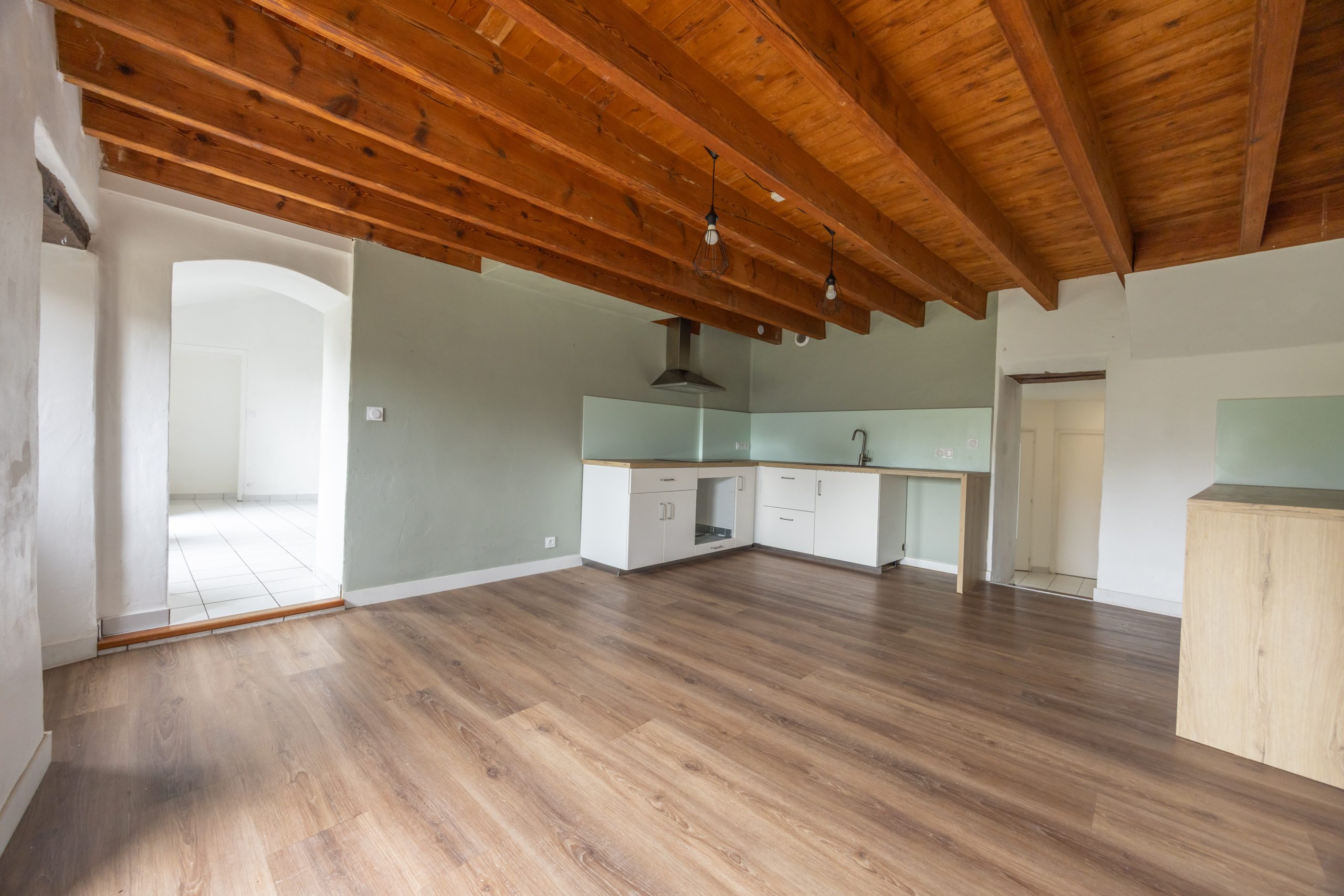 Pièce de vie avec cuisine aménagée et partiellement équipée