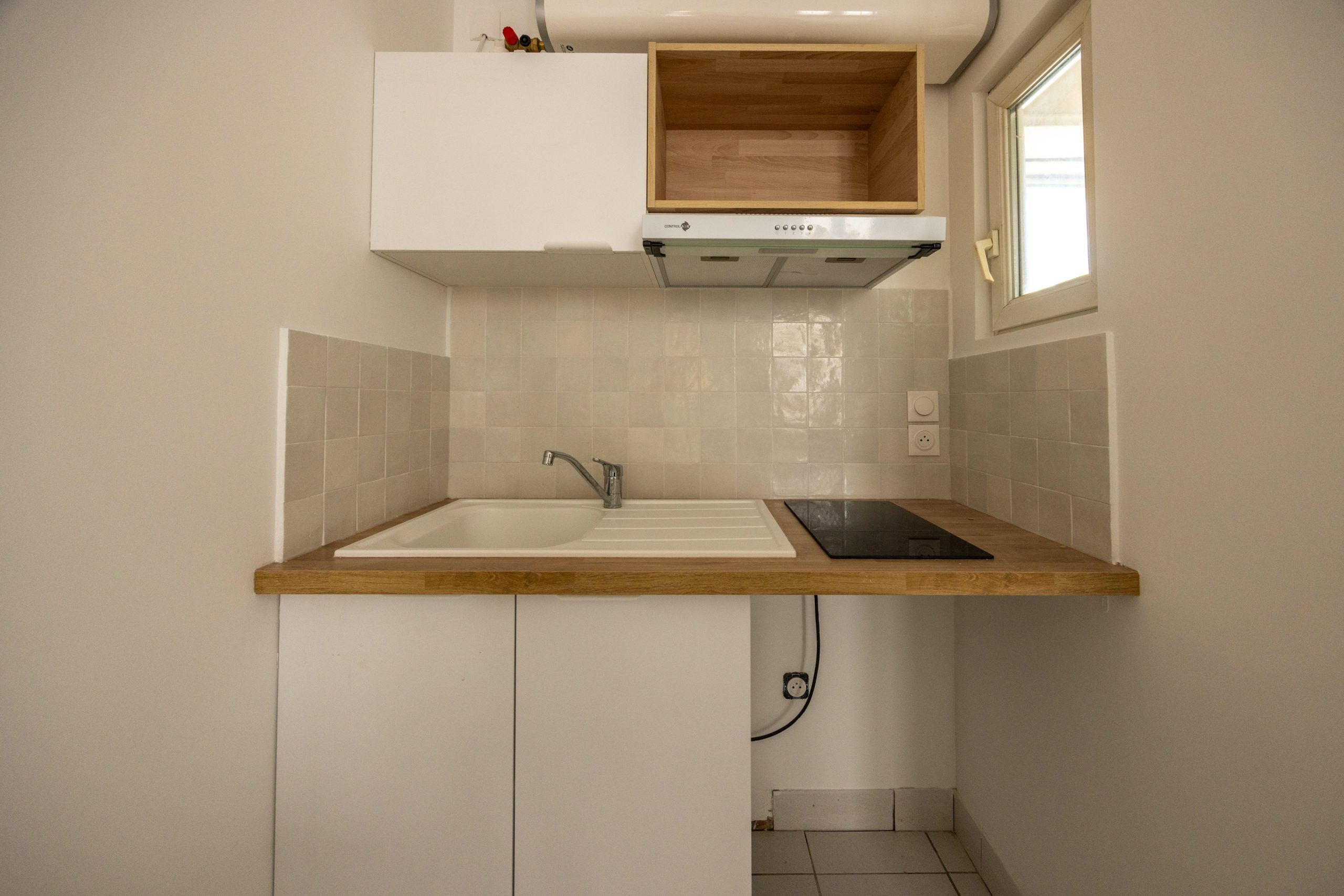 Pièce de vie avec cuisine aménagée et équipée de plaques de cuisson, hotte et réfrigérateur