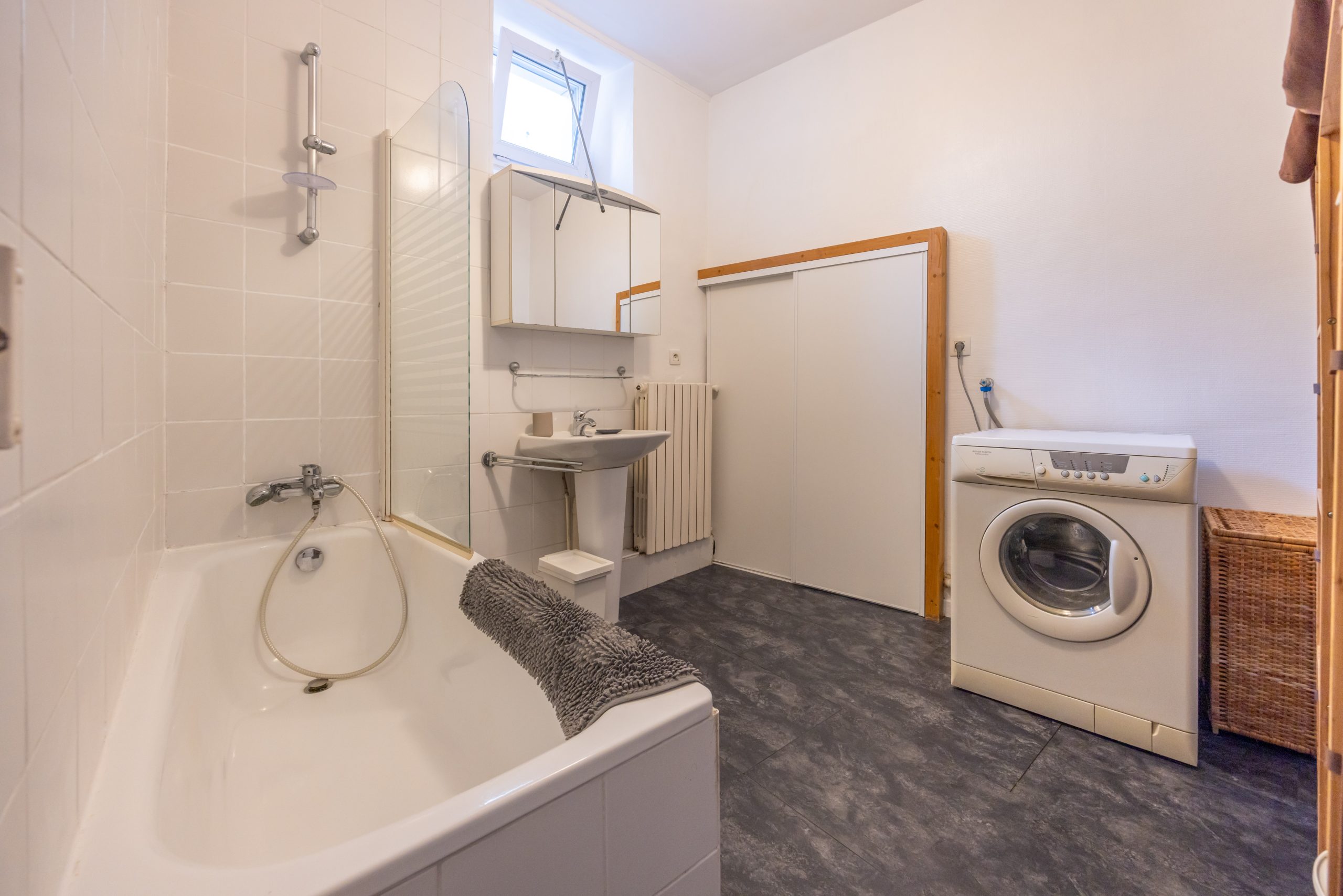 Salle de bains avec machine à laver et placard