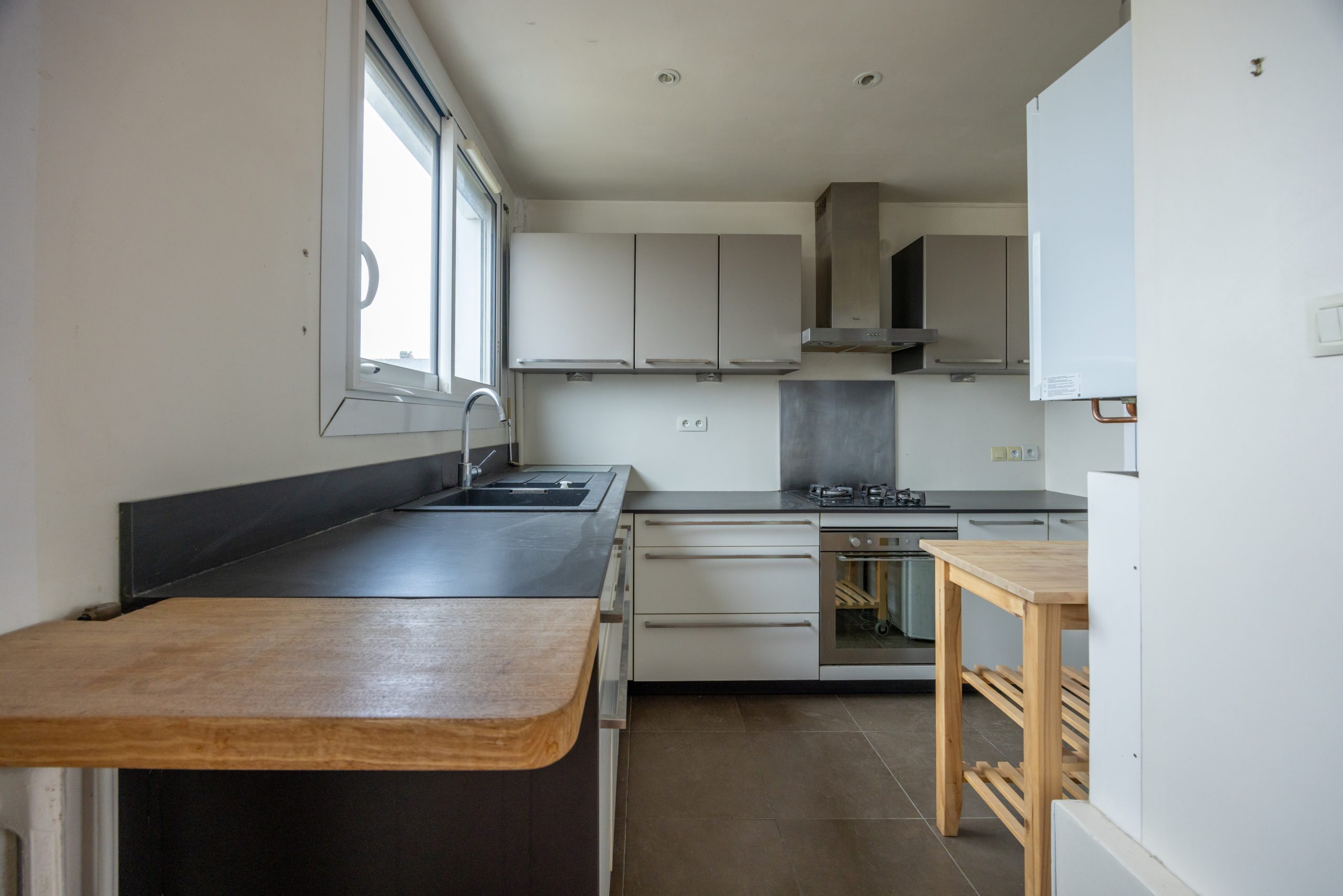 Pièce de vie avec cuisine ouverte, aménagée et équipée (plaque gaz, four, hotte, lave-vaisselle)