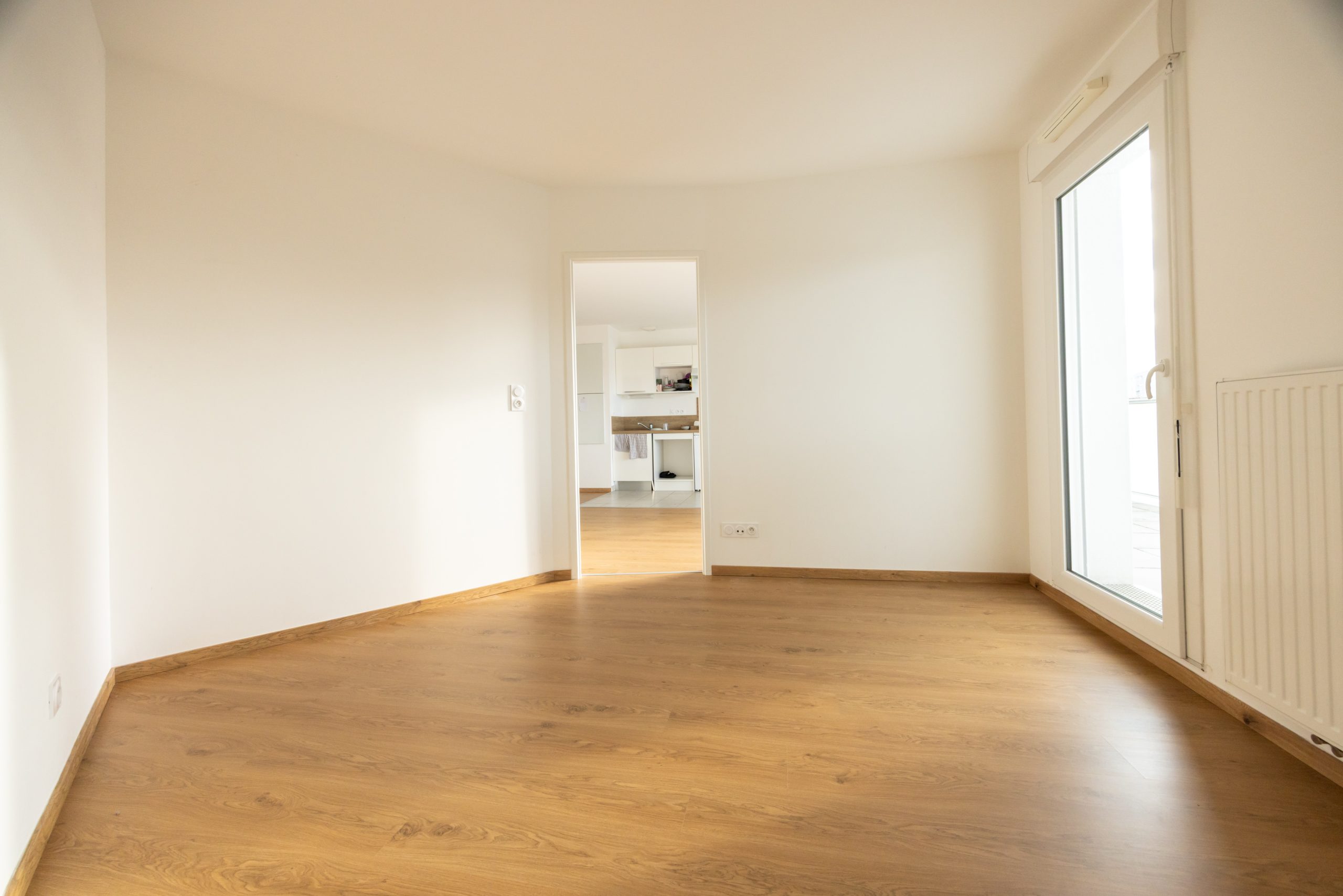 Pièce de vie avec cuisine aménagée et équipée de plaques de cuisson, hotte et réfrigérateur